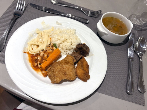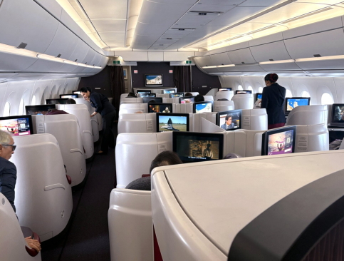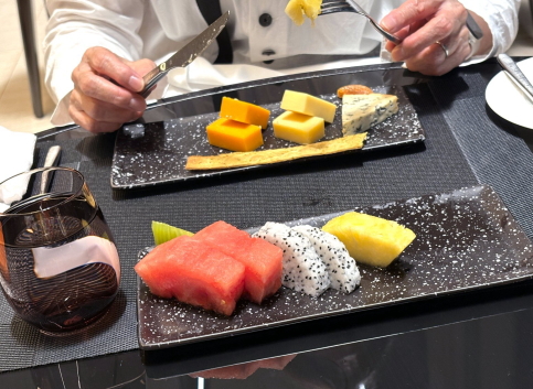 | カタール航空のビジネス・ラウンジに入ってみました。広々としてメチャきれい!係のウエイターもたくさんおり、目が合うと直ぐ来てくれます。 成田のラウンジで軽く食事、その後成田から13時間のフライトで2回の食事。という事で、ここではフルーツとチーズ、それにワインだけを頂きました。 ここからカイロまでの3時間のフライトでまた食事が出るので、ずっと食べっぱなし。お腹の管理をきちんとしないとエラいことになります。 |