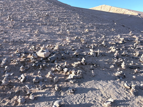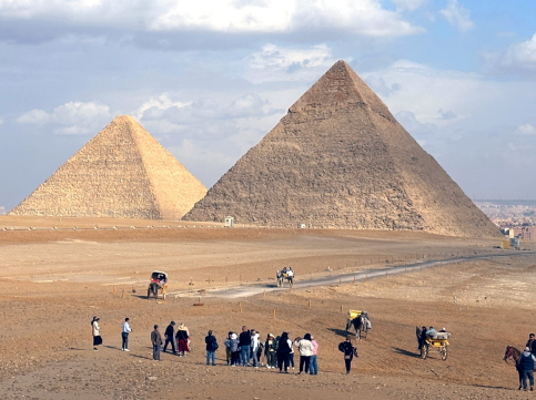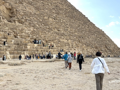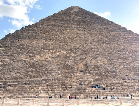 | ピラミッドは四角錐なのは誰もが知っていますが、近くに行くと全く別の形に見えます。 - 面が視界に収まらない - 斜面が壁に見える - 遠近法が崩れる - 結果として、四角錐ではなく“巨大な石の山”のように見える、つまり、ピラミッドは“遠くから見るために設計された建造物”か、と思ったりします。 ピラミッドは高さ146m、基底は230mと巨大ですが、他に比較する建物が近くにないので、ボクには大きさがイメージとして十分に伝わってきませんでした。 |
