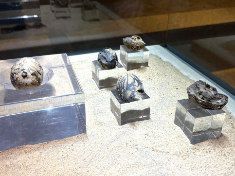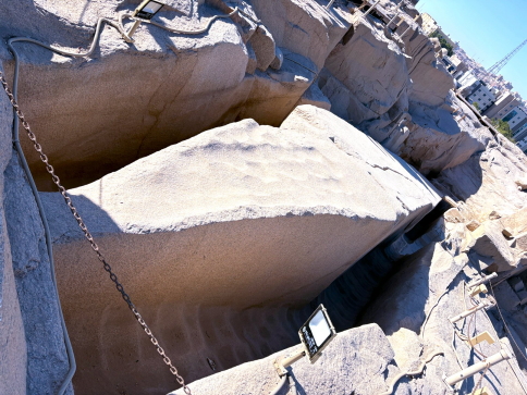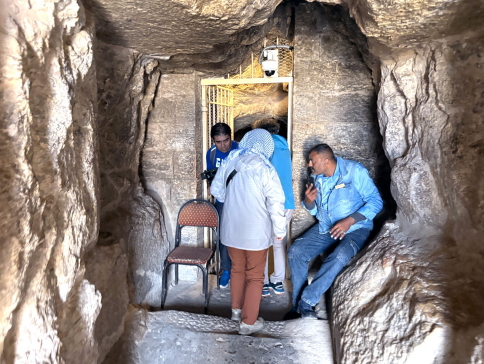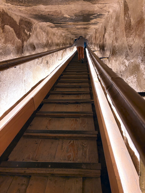 | ピラミッドのど真ん中の、”王の間”にたどり着きました。 巨大な花崗岩のブロックが天井にあり、部屋が圧壊しないように、加重を支えている構造のようです。 石棺がありますが、中のミイラは盗掘されて、ありません。多くの副葬品(貴金属など)があったはずですが、これらも埋葬後間もなくの時期に、盗掘されてます。 盗掘は内部を熟知した工事関係者、神官などが関与した可能性が高いそうです。 内部は1960年くらいから換気がされていて酸欠を防止、本格的には今年(2025年)からとありました。 |