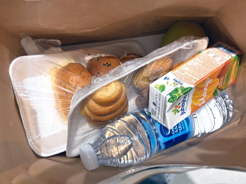 | 昨夜は、冷房で冷え切った部屋、エアコンを暖房に切り替えても暖かくなりません。添乗員に連絡をすると、「このホテルには暖房はありません」、とのこと。再度、エー!! 仕方ないので毛布を持ってきてもらい、厚着をして寝るしかありませんでした。 翌朝は06:15のフライトでアスワンまで行くので、04:00にホテルを出て、バスに乗ります。朝飯は大きな袋の中に入った”BOX BREAKFAST”、バスの中、空港待合室、飛行機の中で分けて頂きました。 |