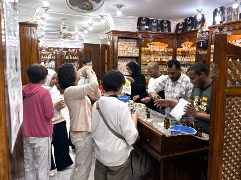| ツアークループは女性13名、男性5名で、女性が圧倒的に多いのは、近年の特徴です。 店では皆さん目の色変えて大いに散財、私のカミさんもアロマオイル(香油)を買ってました。 何種類かの中でボクの気に入った香りもあったので、書斎に匂いをつけても良いかも、、、。 ボクはガラスの香水入れが大いに気に入ったので、何個か買いました。目的は昨日採取したサハラ砂漠の砂を入れる容器として、です。 |