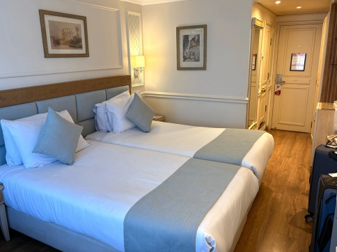 | カイロというと暑いところ、というイメージがあり、ボクも夏用の服をメインにを持ってきました。 事前に、「朝夕は12〜3℃まで冷え込むので、その準備はやってきて下さい」、という連絡は受けていました。 日没になると18℃程度、最低温度は10℃近くになります。カイロは北緯30度、鹿児島の南部とほぼ同じです。 ホテルに着いてチェックイン、部屋に入ります。ドアーを開けた瞬間、冷蔵庫の扉を開けたような冷気が身体を包みました。何と!冷房が入っているのです。エー!! |