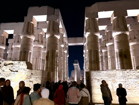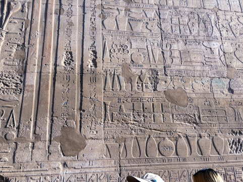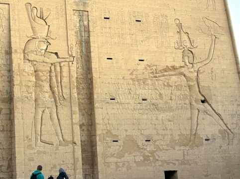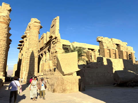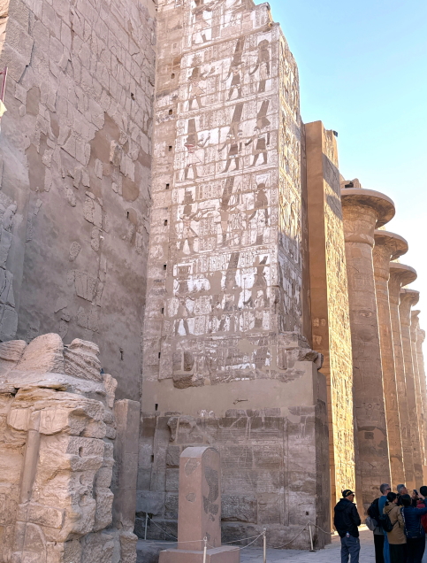 | つまり支配者は神に繋がっており、神から与えられた権力を行使している、こういう事なのですね。 入り口を入ると巨大な柱群があり、これが神の世界に入る境界を示しています。 ではこの神殿の中には誰が入れたのか、一般人も入る事ができたのか?ガイドのナグラーさんに聞いてみました。 答えは「誰でも入れました」。 これは大いに疑問に残り、旅から帰って調べてみました。 |