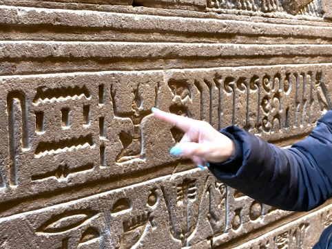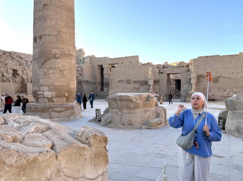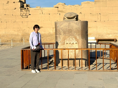| 巨大なスカラベ(聖甲虫)像があり、この周りをグルグル回ると良いことがある、というおまじないです。スカラベとは”フンコロガシを神格化したもの”です。 1周は願い事、3周は幸運、7周は結婚、9周は子宝、という事でカミさんは3回廻っておりました。 これは古代の宗教儀式とは何の関係もなく、近代以降の観光文化の中で広まった”おまじない”です。 スカラベ像自体は今から3500年前に作られたそうです。 ビデオ:おまじないの周回 |