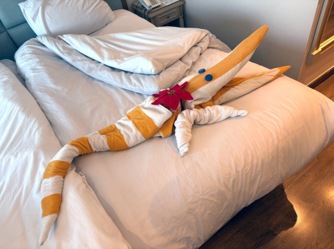 | ベッドの半分以上の長さの、ワニちゃんのタオルアート、最初はびっくりでしたが、段々飽きてきました。 日本のホテルでタオルアートを見かける事はないのですが、これはチップ文化と関係があるように思います。 上手に作ってくれたタオルアートには、やはりチップを置きたくなりますよね。 タオルアートを日本で見ないのは、部屋の清掃係に要求する内容が、他国と日本は違う、というのもあると思います。 |