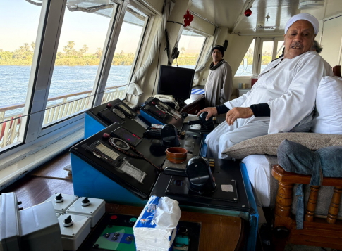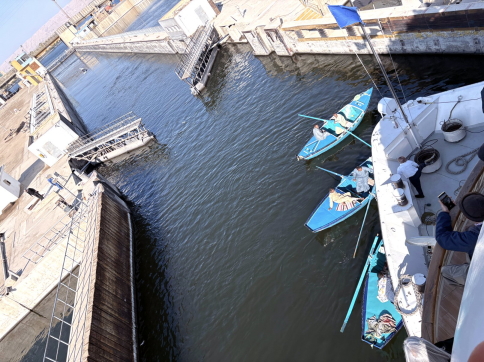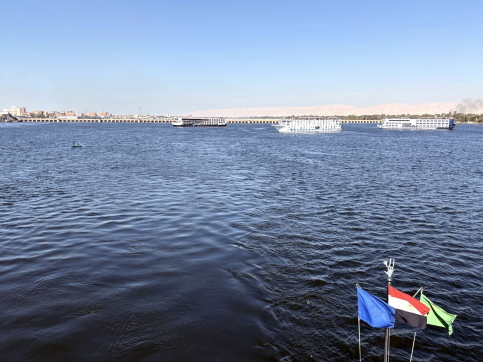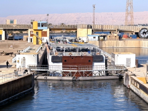 | エドフを08:00頃出港して4時間後の正午頃、船はエスナ水門(閘門)に到着します。エドフを出港したクルーズ船は10隻以上、15隻くらいいたかも知れません。エスナ水門はナイル川の水位差約8mを調整するためです。 クルーズ船は、エドフをほぼ同時に出港するので、水門前にはズラリと船が並びます。1隻の通過時間は10分〜15分、私たちの船は後の方なので、ここで2時間くらい足止めとなりました。 ビデオ:エスナ水門前で通過を待つクルーズ船群(1) ビデオ:エスナ水門前で通過を待つクルーズ船群(2) |