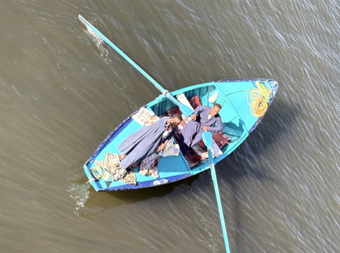 | エスナ水門通過を待つ各クルーズ船には、土産物売りの手こぎボートが何隻も近づき、物売りを始めます。 クルーズ船は水門通過待ちで、殆ど停船状態になること、客が甲板上に群がること、などで商売をするには絶好のチャンスなのです。 ビニール袋に入れた商品をボートから、クルーズ船の甲板まで投げ上げて、客は気に入ればお金を入れてその袋を投げ返す、という非常にユニークな方法の商売です。見事に土産物を投げていました。 ビデオ:土産物売りのボート |