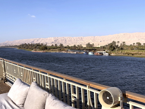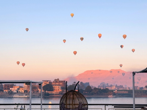 | ツアーは7日目、昼食の後最上甲板に出てみると、陸地の方には多くの熱気球が。 これはルクソール名物の”熱気球サンライズ・ツアー”で、この日は40基程度が上がっていました。 このツアーは超人気で、王家の谷などの有名観光スポットを空から見る事ができ、約45分でひとり100ドル程度だそうです。 熱気球は気流の安定している早朝のみで、特に冬場は風も安定しており、観光客も多いので、たくさん上がるという事でした。 ビデオ:熱気球サンライズ・ツアー” |
