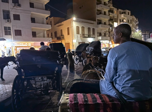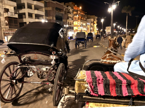 | 見学を終えてクルーズ船の波止場までカレッシュ(小型観光馬車)に乗りました。 これは1頭立てと2頭立てがあり、ボクらが乗ったのは1頭立てのカレッシュ。 ナイル川沿いの夜の町中をパカパカと走ります。こういう馬車に乗るのは初めてです。 馬車文化は19世紀に、ヨーロッパの都市交通の影響を受けて使われるようになったそうですが、今では完全な”観光用”で使われてます。 ビデオ:カレッシュからのルクソールの町並み(1) |