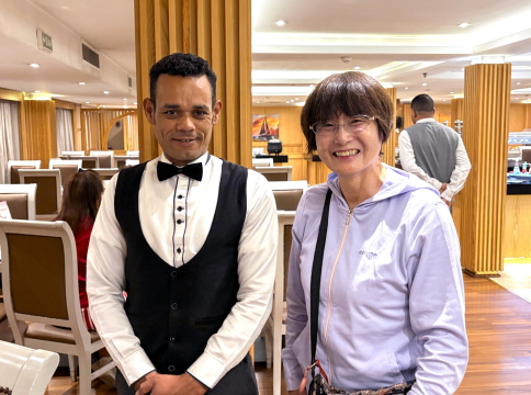 | アスワンからルクソールまで3泊4日のクルーズ船で移動しながらの観光、なかなか充実していました。 朝食と夕食は必ず船で食べ、テーブル担当のウエイターと最後に記念のショットをお願いしました。 彼は英語もキチンとしゃべり、聞くとこの船に来て3年とのこと、動きもキビキビして、ボクの飲むビールをいつも持ってきてくれました。 エジプトの一般的な勤労者の平均月収はドル換算で200ドル(3万円)、彼もそういうレベルなんでしょうか、、、。 |