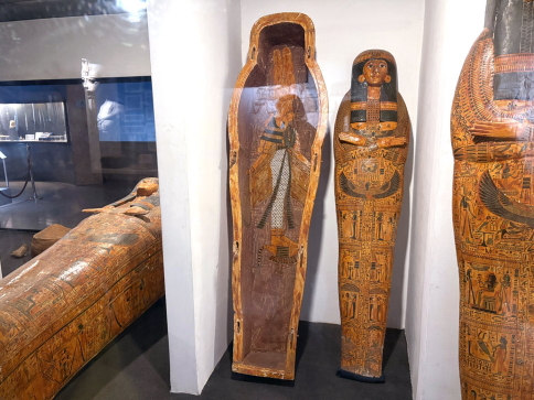 | 3600年ほど前の高位人物の埋葬用石棺です。蓋には故人の姿が彫刻されています。 故人はミイラにされて内棺に入れ、そしてこの石棺に入れる、という方法です。 エジプトでは身体を保存するというのが非常に重要で、体が残らないと魂が戻れない、という思想だったとあります。 ボクはここに来て、何でエジプト人はミイラにこだわるのか、やっと理解ができました。 |