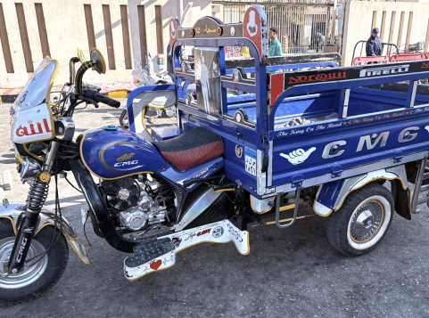 | エジプトではよく見かけ、人も荷物も運んでいました。 CMGというのは中国メーカーで、大体200CCエンジン、このように3輪にして途上国に売っています。 細部までは観察しませんでしたが、日本のバイクは60年前でもこういう造りはしない、という構造でした。 フィリピンでも似たようなのがあり、”トライシクル”と言ってサイドカータイプで、人を乗せるのが目的でした。 エジプトのように3輪タイプもあると聞いてはいたのですが、ボクは見たことがありませんでした。 |