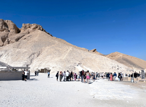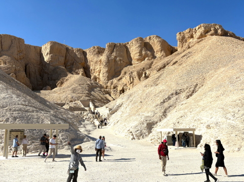 | 王家の谷とは3500年〜3000年前に、ファラオとその家族・高位貴族を地下に埋葬するために造られた“巨大な地下宮殿群”です。 地下宮殿群?と聞いてあれ?墓でしょ?となった訳ですが、質問をする時間もなく、中に入ってわかったのは、やはり”宮殿”でした。 つまり物理的には”墓”であるが、思想的には”死後の宮殿”、つまり”王が死後に住む場所”という事です。これで実際に見た事と、その考え方が理解できた、という次第でした。 ビデオ:死後宮殿(墓)の入り口付近 |