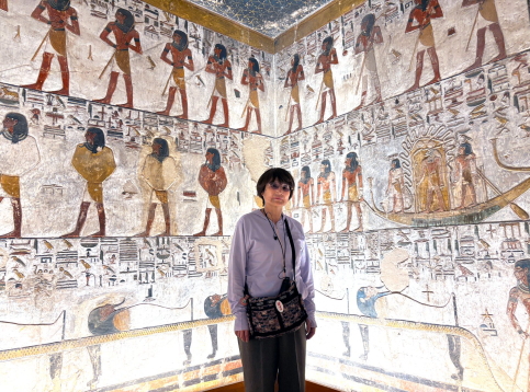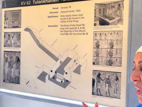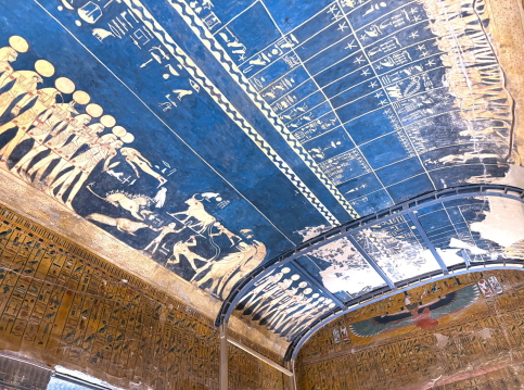 | 王家の谷で最も美しく、深く、複雑で、芸術的な墓、という説明です。”王家の谷の最高傑作”いう構造です。 エジプトの墓は床=大地、壁=冥界、天井=天空、という“宇宙の三層構造”で設計されており、天井が青いのは王が死後に帰るべき場所=天空を示すため、とあります。 ここの入場は別料金で、オプショナルツアーとして140ドル(約2万円)でした。見学は約30分ほどで終えましたが、お金には代え難い、価値があったと思います。 ビデオ:KV17の中の様子(1) ビデオ:KV17の中の様子(2) |