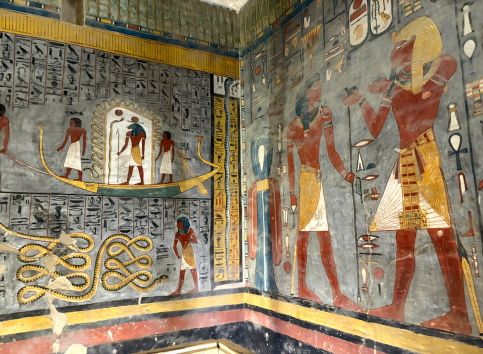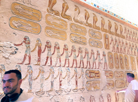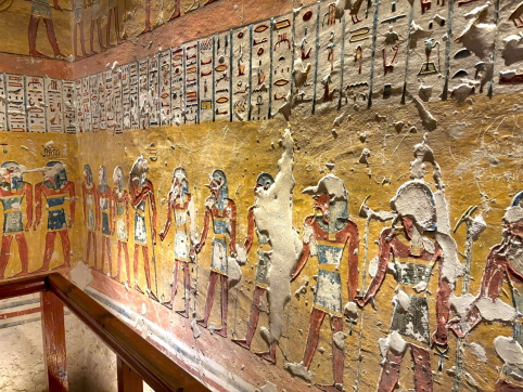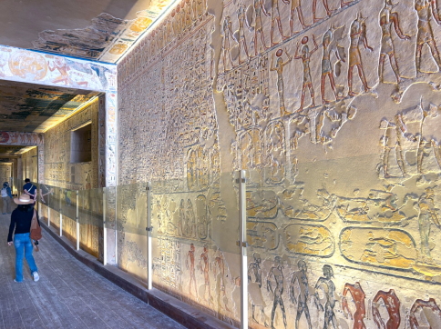 | 壁画の密度が高く、彩色が見事です。3200年前に作られたとは思えない見事さで、この色には圧倒されます。 多くの墓はナイル川の洪水、落石、盗掘により損傷が激しいのですが、KV9は入り口が高く水害がほぼゼロ、という幸運に恵まれ、盗掘には遭っているものの、損傷が少ない、という研究結果です。 古代エジプトの顔料は非常に安定しており、太陽に当たらず、水も浴びていないと、こういう色が残るんですね。 最初は色は復元かと思いましたが、違いました。 ビデオ:KV9の中の様子 |