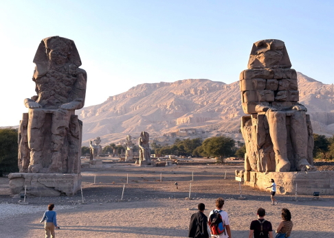 | ハトシェプストの葬祭殿近くには、かつてアメンホテプ3世の巨大な葬祭殿があり、その入り口にあったアメンホテプ3世の像が残っています。 これはハトシェプストの100年くらいあとの王です。 葬祭殿が跡形もないのは、ナイル川の氾濫、建材の再利用、風化などによる、との事です。 建材の再利用で葬祭殿はなくなった、、、というのは何となくわかるような気がします。 |