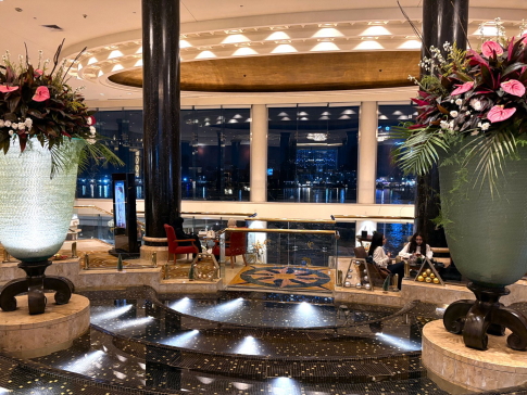 | ホテルは”ヒルトンカイログランドホテル”、ナイル川の中州の中に建つ、文句なしのホテルです。 この辺でナイル川は2本にわかれ、それぞれの川幅は300m〜500mくらいです。 さあ、食事も終わったので、ビールでも飲もうかとフロント横のバーに行ったところ、「ビールはありません」、とバーテンが言う。 ホテルによって、ビールを提供できるバーが限られており、詳しく聞けばどこか(上層階とかプールサイド)で飲めるのでしょうが、面倒なので諦めました。 |